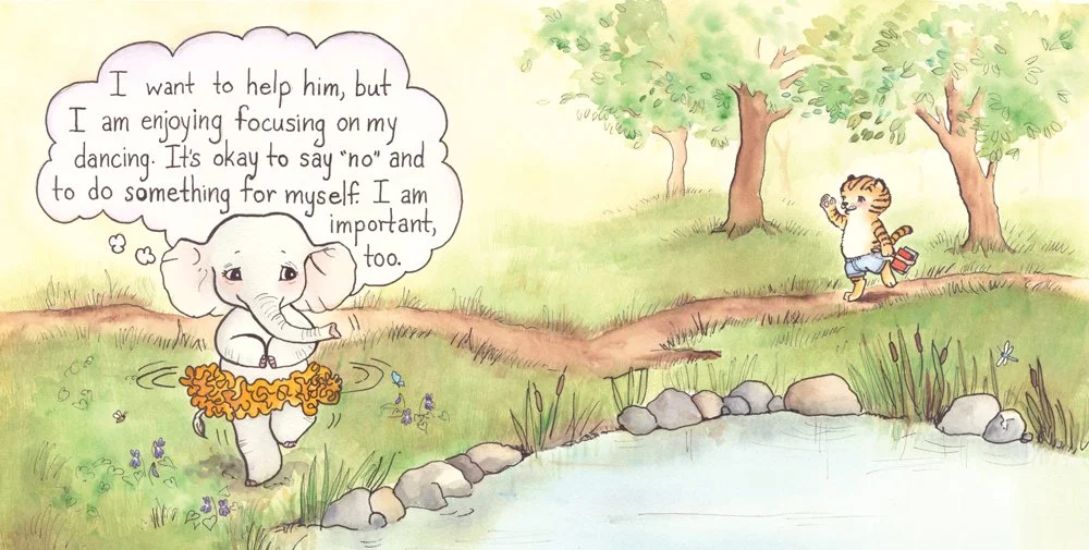 Ella Elephant is a “helper” - someone who likes to help others, often putting others first, sometimes at her own expense. She worries about not doing enough or helping enough. She has trouble sleeping and is thinking about her day when she is visited by her inner wisdom in the form of Twinkle, a star that illuminates paths (choices) and allows her to see things in a new way.