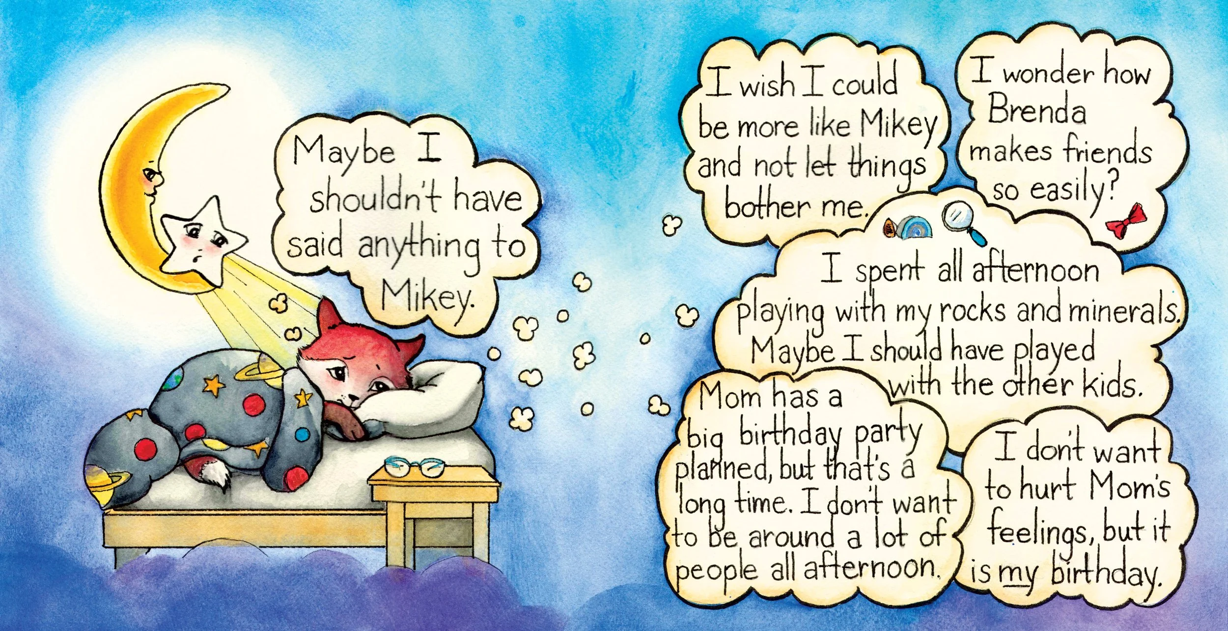 Freddy Fox is an “investigator or observer” - someone who is intelligent, curious, and interested in how things work. He sometimes doesn’t understand others and how he belongs. He has trouble sleeping and is thinking about his day when he is visited by his inner wisdom in the form of Twinkle, a star that illuminates paths (choices) and allows him to see things in a new way.